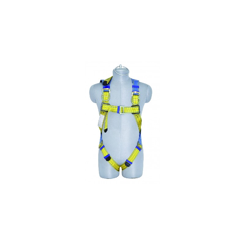 Arnés a 2 colores con 1 punto de anclaje dorsal y cinta de extensión + 1 punto de anclaje esternal con 2 anillas “D”. Regulable en hombros y muslos. Cinta pélvica. Bolsa de red.